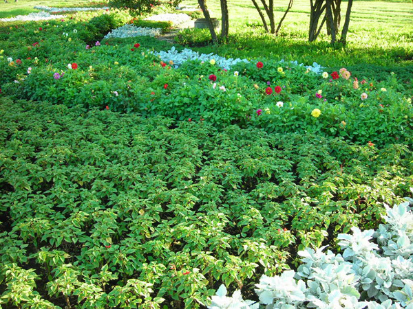 Растительный ковер - это цветник, в котором используются растения с низким ростом, которые плотно покрывают землю. Он может быть использован для озеленения склонов и уступов.