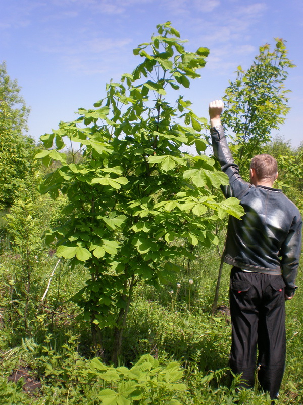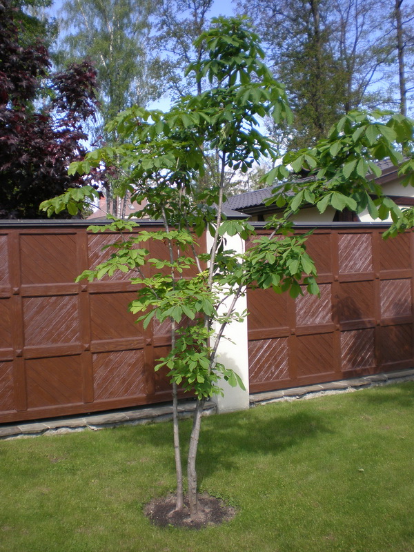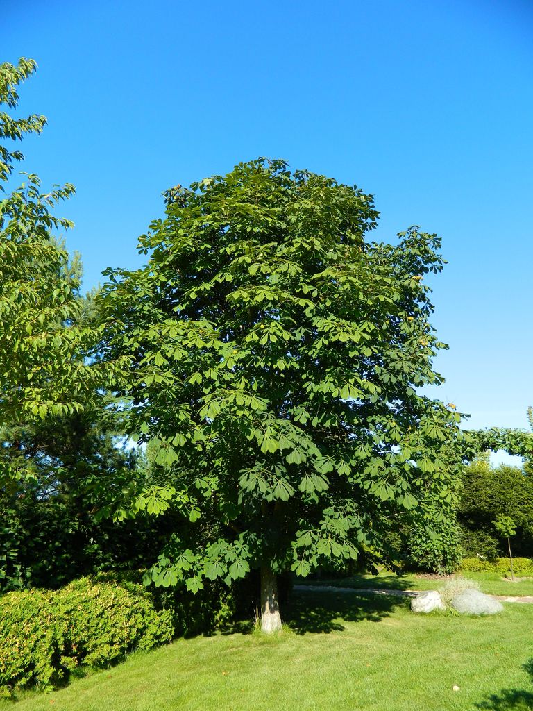 Дерево, высотой до 22 метров, с широкой раскидистой, густой кроной листьев. Листья пальчатообразные, на длинных черешках с 5-7-обратнояйцевидными, клиновидными, короткозаостренными долями. Цветки белые, собранные в длинные конусовидные прямостоячие соцветия из смешанных тычиночных (мужских), двуполых и пестичных (женских) цветков. Чашечка из 5 сросшихся опадающих листочков. Лепестков 5, свободных, с желтым или розовым пятнышком у основания; три лепестка венчика прямые, 2 согнутые, вниз по сгибу. Тычинки на длинных ножках с красными пыльниками. Плод круглая, диаметром в 6 см растрескивающаяся капсула с острыми шипами. Семена размерами в диаметре 1-3-4 см коричневые. Цветет в мае.