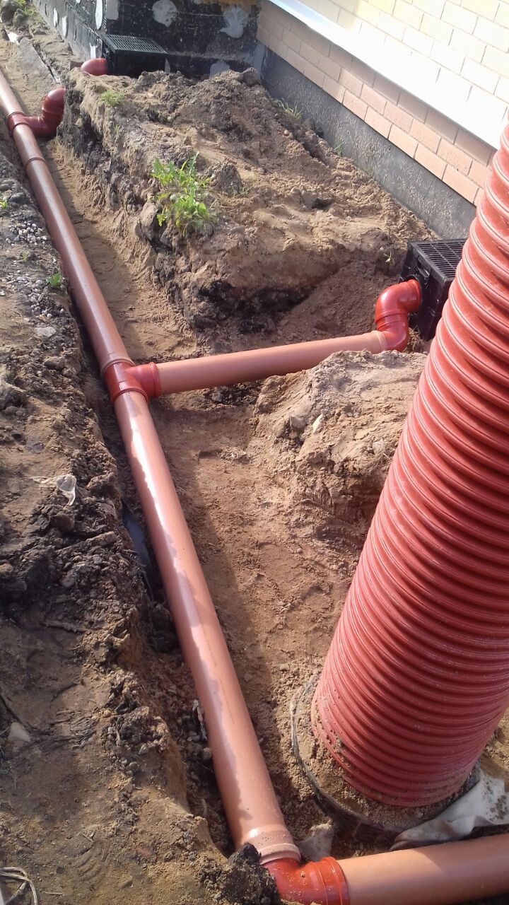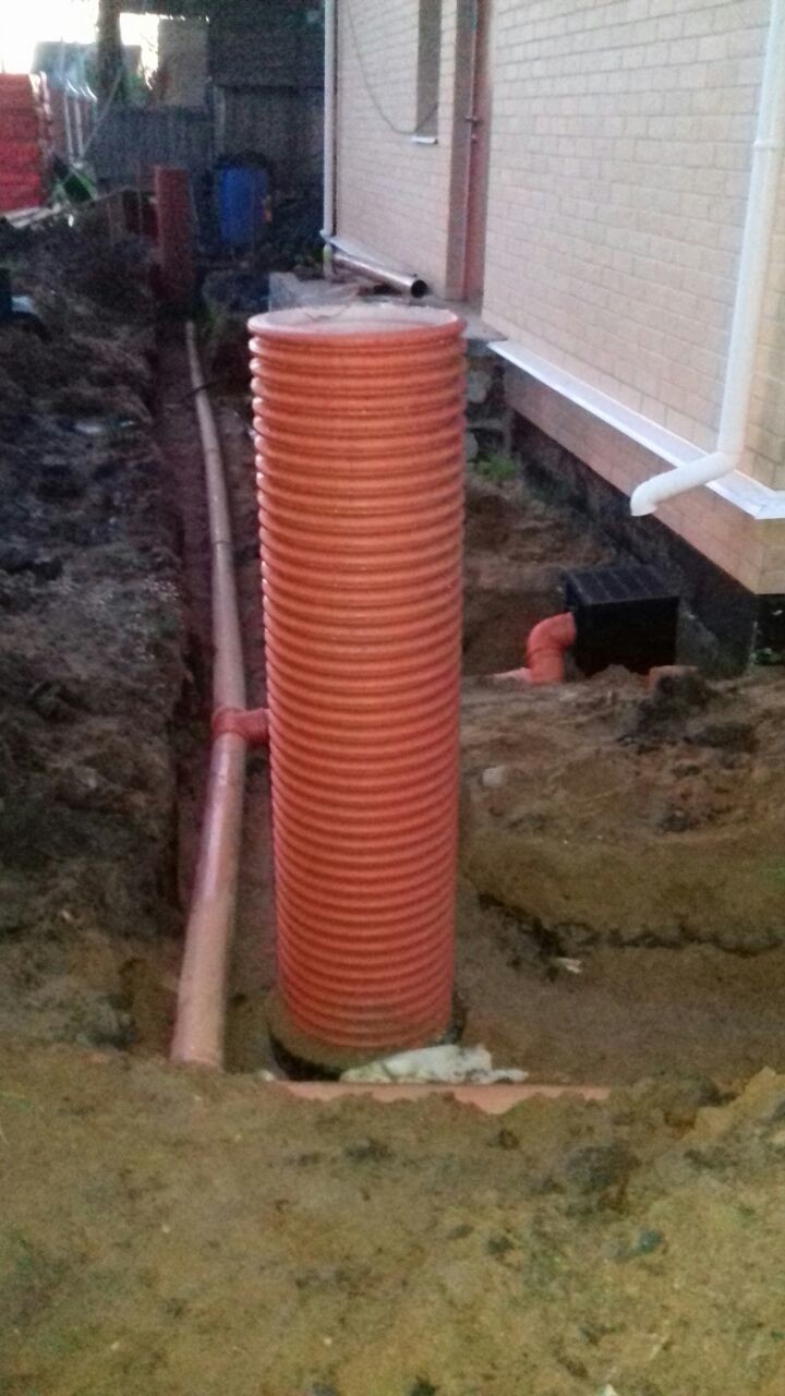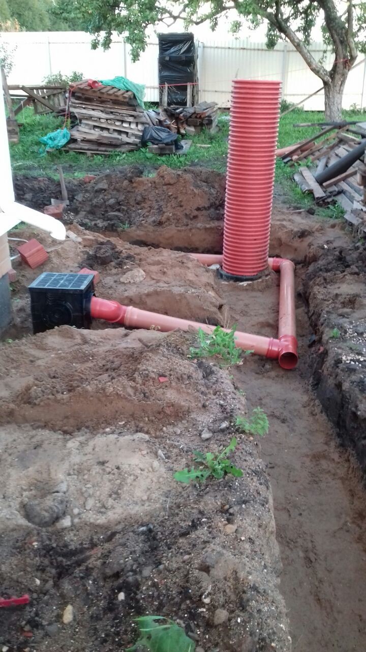 • в угловых точках специалисты выкапывают накопительные канализационные колодцы – важно разместить их так, чтобы две трубы можно было промыть из одного колодца;