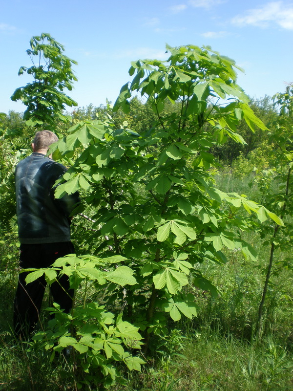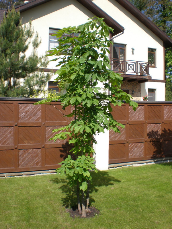 Дерево, высотой до 22 метров, с широкой раскидистой, густой кроной листьев. Листья пальчатообразные, на длинных черешках с 5-7-обратнояйцевидными, клиновидными, короткозаостренными долями. Цветки белые, собранные в длинные конусовидные прямостоячие соцветия из смешанных тычиночных (мужских), двуполых и пестичных (женских) цветков. Чашечка из 5 сросшихся опадающих листочков. Лепестков 5, свободных, с желтым или розовым пятнышком у основания; три лепестка венчика прямые, 2 согнутые, вниз по сгибу. Тычинки на длинных ножках с красными пыльниками. Плод круглая, диаметром в 6 см растрескивающаяся капсула с острыми шипами. Семена размерами в диаметре 1-3-4 см коричневые. Цветет в мае.